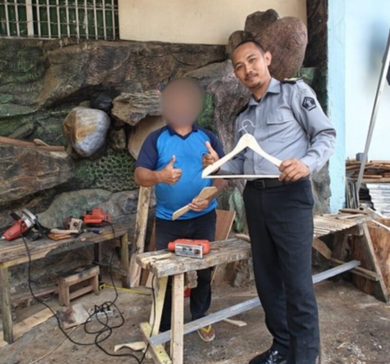 Para warga binaan dilatih membuat gantungan baju dari tahap perancangan, pemotongan, pembentukan, hingga finishing.